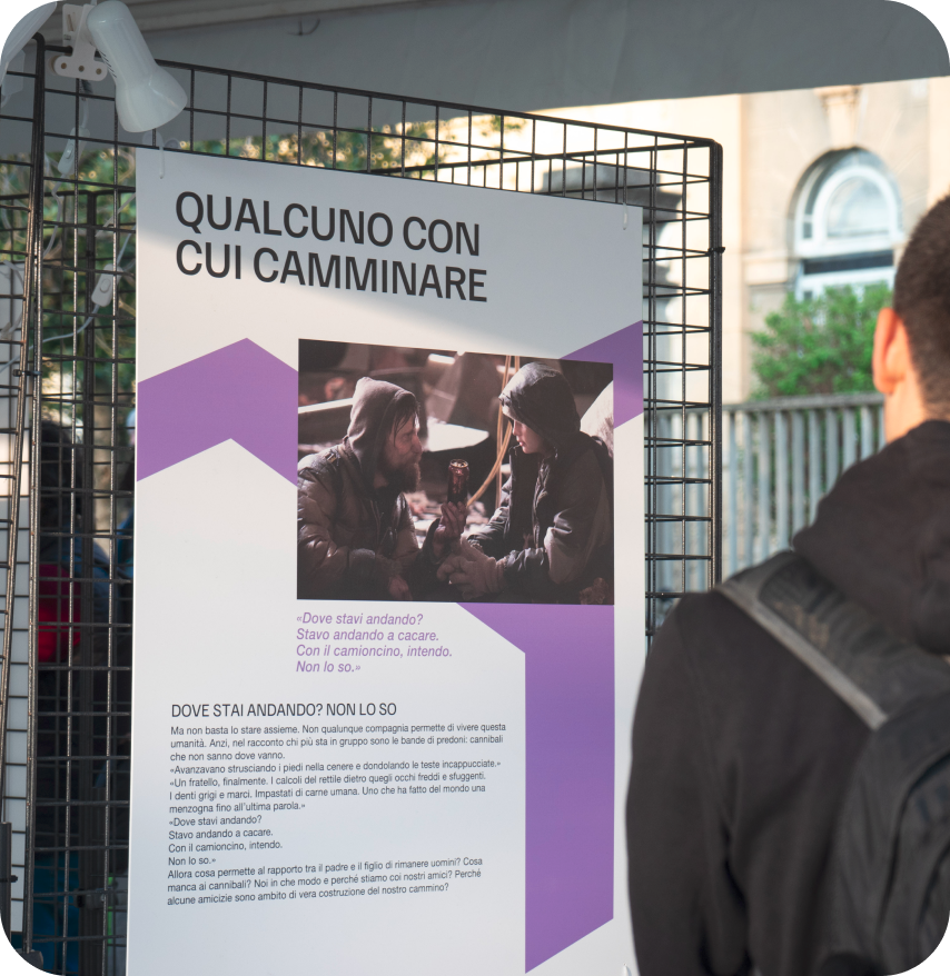 Le crisi attuali (alluvione in Romagna, guerre in Ucraina e Medio Oriente) sollevano la domanda: in un mondo drammatico, si può essere uomini? Ispirata a "La strada" di McCarthy e a riflessioni studentesche, la mostra cerca un fuoco che guidi nel buio.